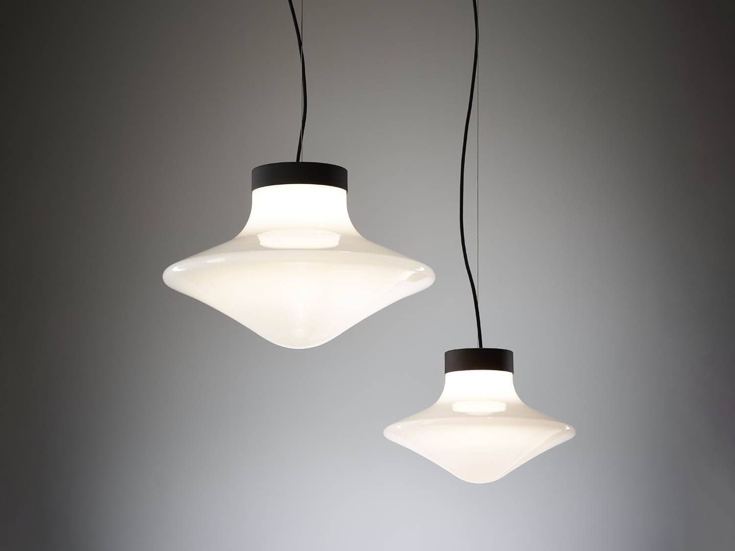 Trottola offers two sizes of suspension and table lights in handblown opaline glass. The table variant is fitted with the innovative BROKIS connector, which makes it easy to disconnect the light and move it about the interior and also facilitates disassembly for maintenance and cleaning.