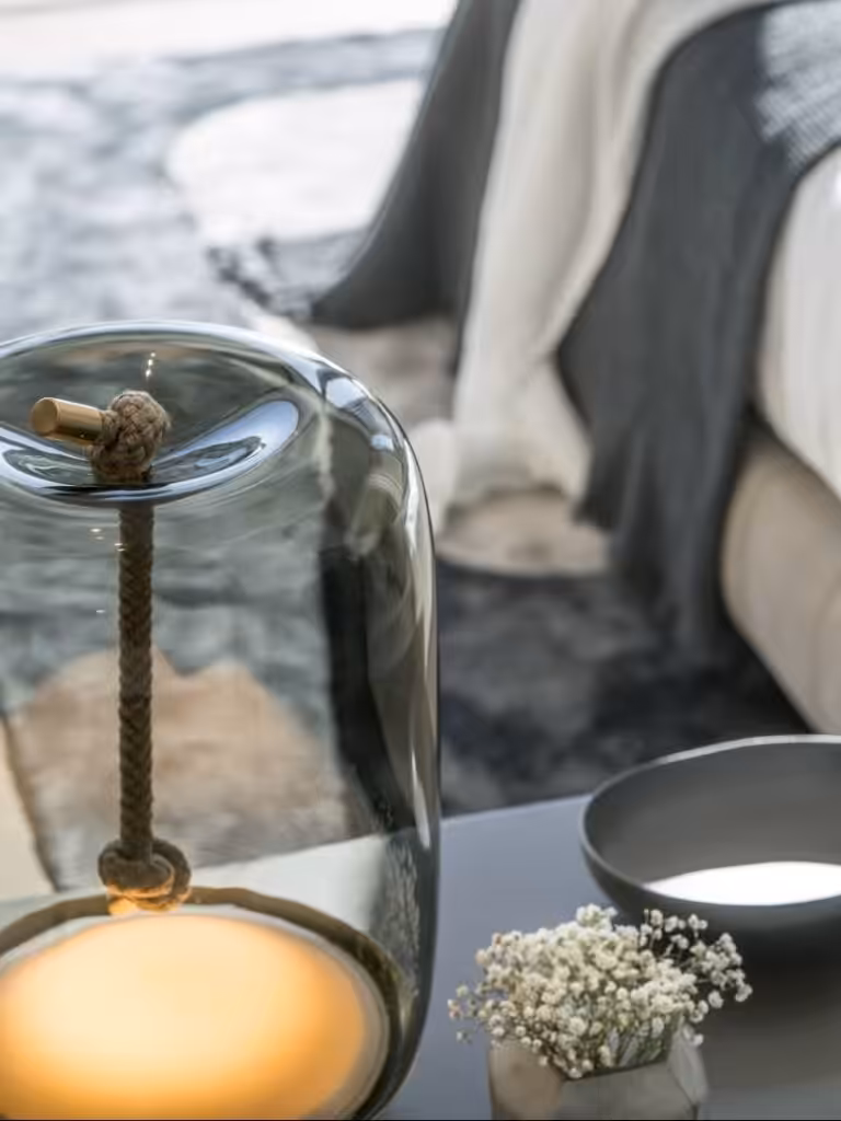 Knot, a collection of stately lights, contrasts two dissimilar materials, two dissimilar notions: gentle curves in clear handblown glass against the austerity of coarse rope. The resulting design is striking, forthright, and dignified at the same time.
