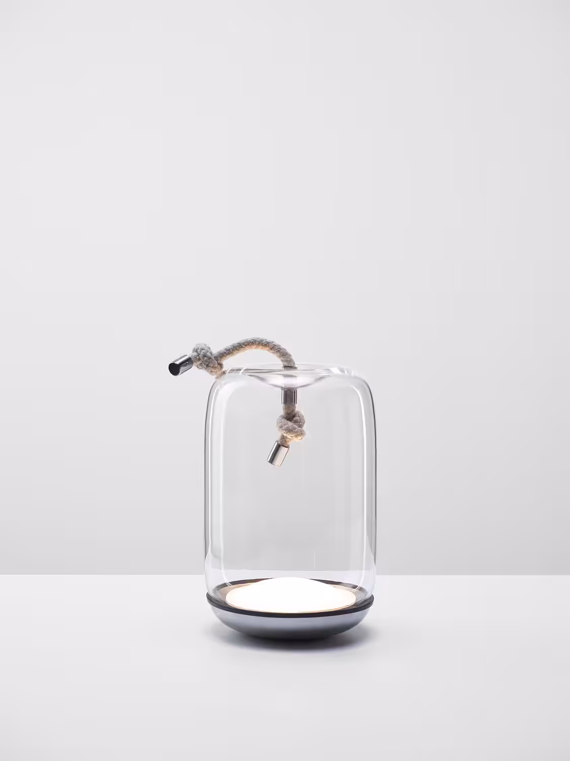 Knot Small Cilindro Table Battery is IP44 compliant for outdoor use, that provides 4.5 hours of light on a single charge. The original Knot collection features full-bodied globes of varying shapes and sizes penetrated by robust cords that seemingly pull the glass inward for a bemusing plastic effect. The LED light source is cradled in a handsome bottom piece, which is fashioned from refined metal.
