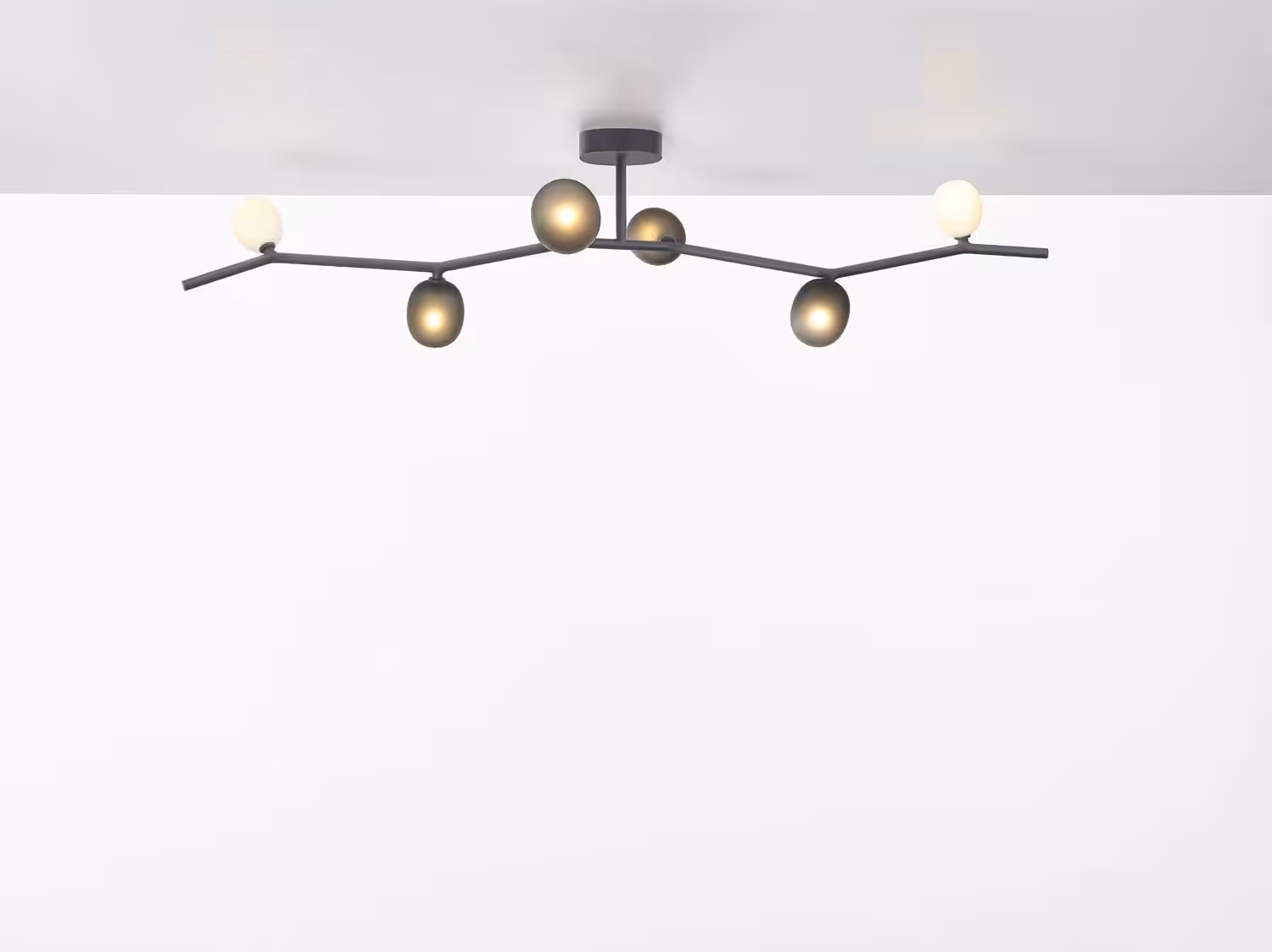 Ivy is a modular system featuring glass components of three colours positioned on branches in a left-to-right sequence according to the design of the light. Glass colours can be combined on the light according to client’s preferences.