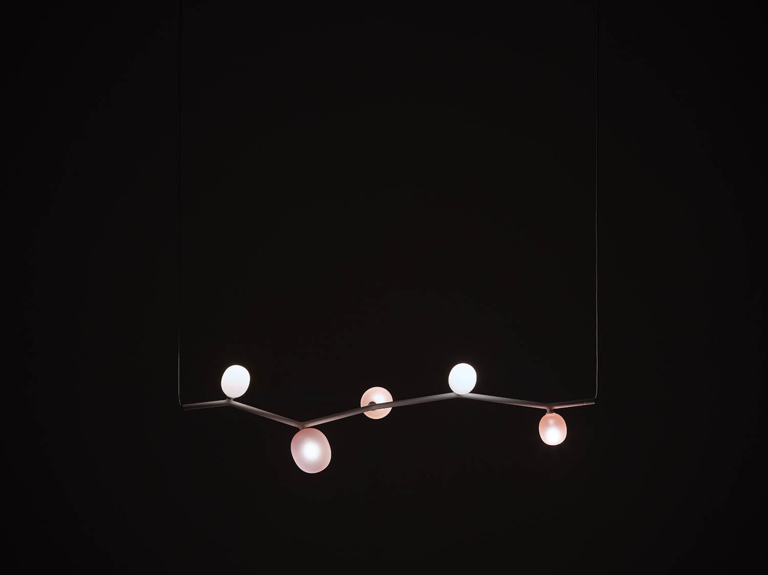 Ivy is a modular system featuring glass components of three colours positioned on branches in a left-to-right sequence according to the design of the light. Glass colours can be combined on the light according to client’s preferences.