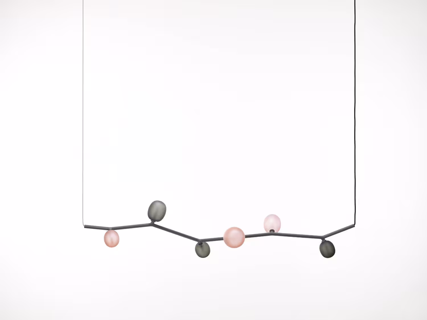 Ivy is a modular system featuring glass components of three colours positioned on branches in a left-to-right sequence according to the design of the light. Glass colours can be combined on the light according to client’s preferences.