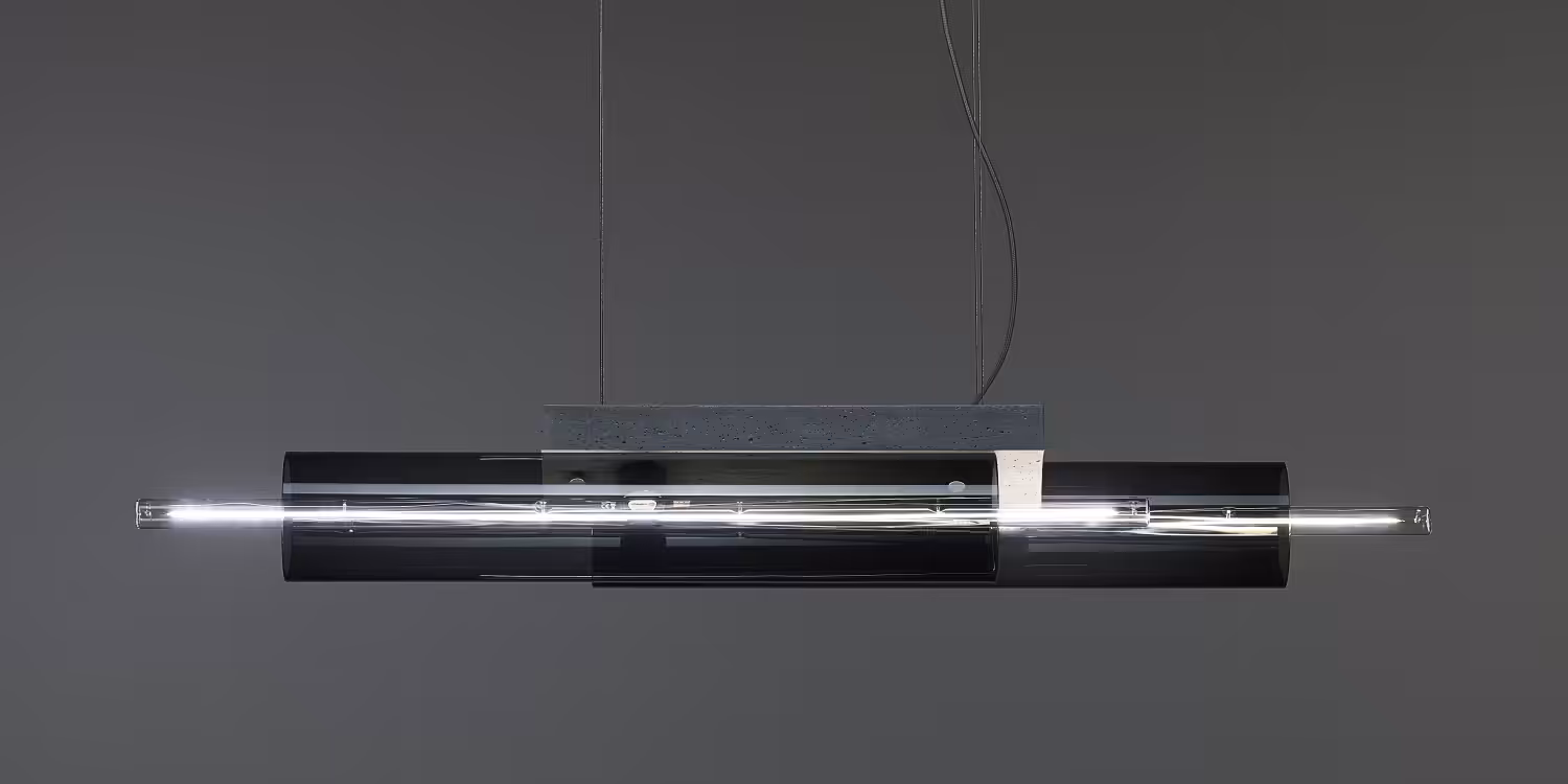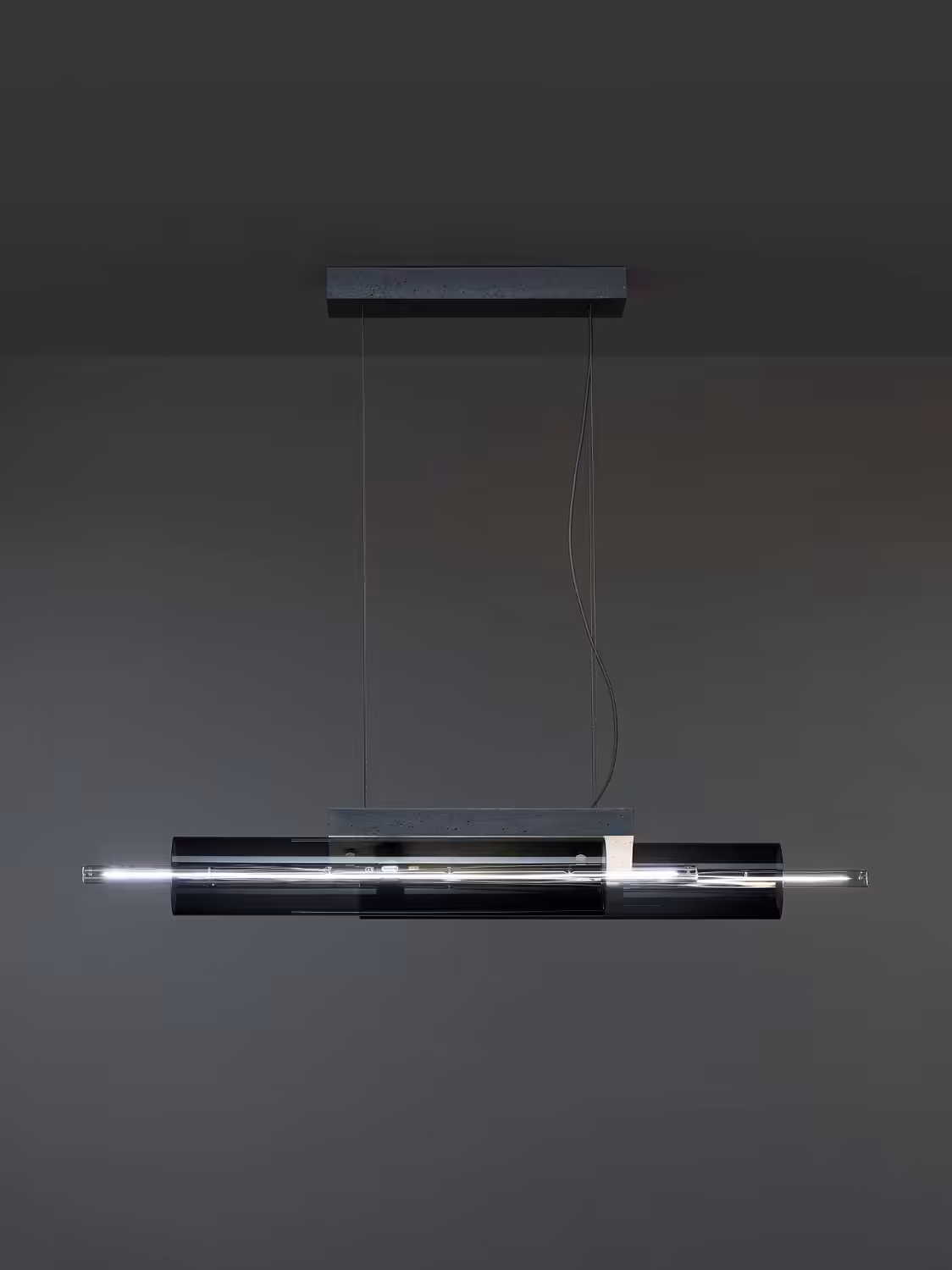 The piece is cast in different rectangular volumes specifically for each type of light, accommodating both simple and multiple assemblies for a remarkable degree of versatility. The centerline matte light tube seemingly levitates inside a delicate sleeve of either frosted or clear glass cradled in the concrete.