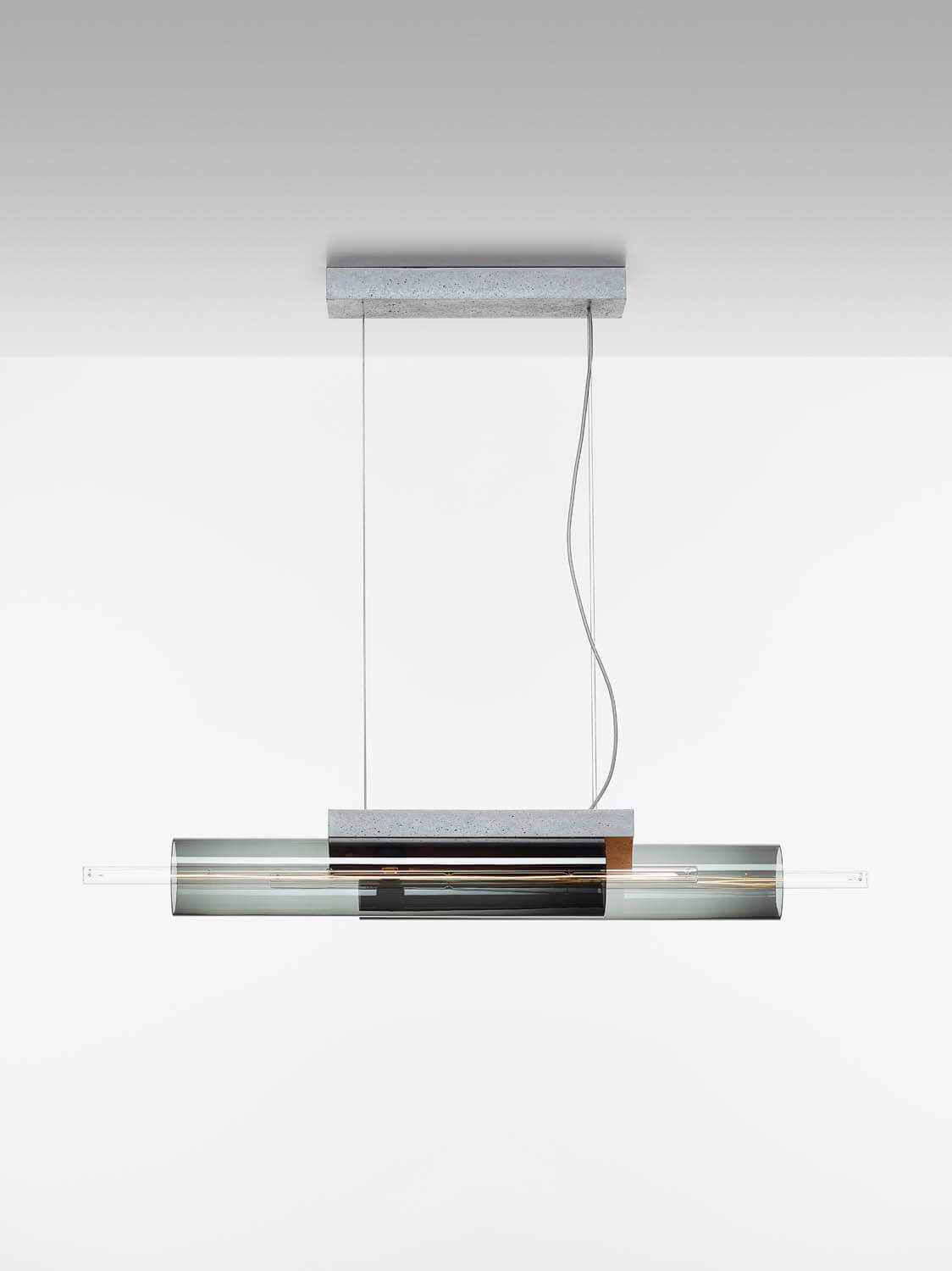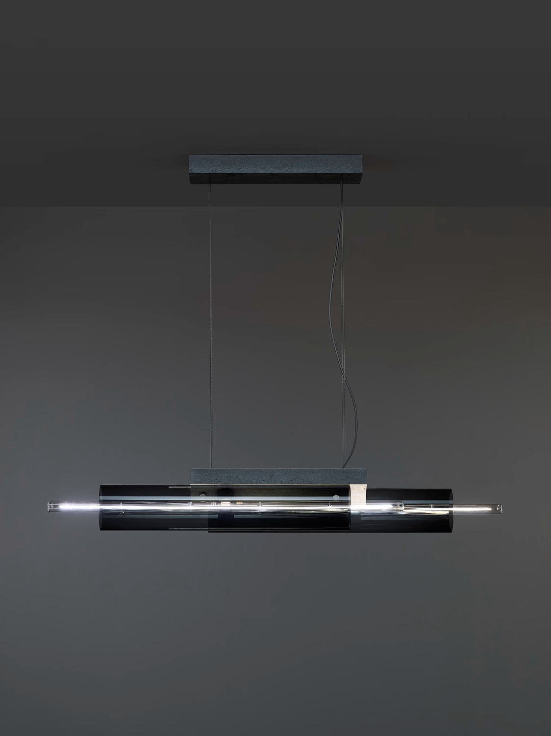 The piece is cast in different rectangular volumes specifically for each type of light, accommodating both simple and multiple assemblies for a remarkable degree of versatility. The centerline matte light tube seemingly levitates inside a delicate sleeve of either frosted or clear glass cradled in the concrete.