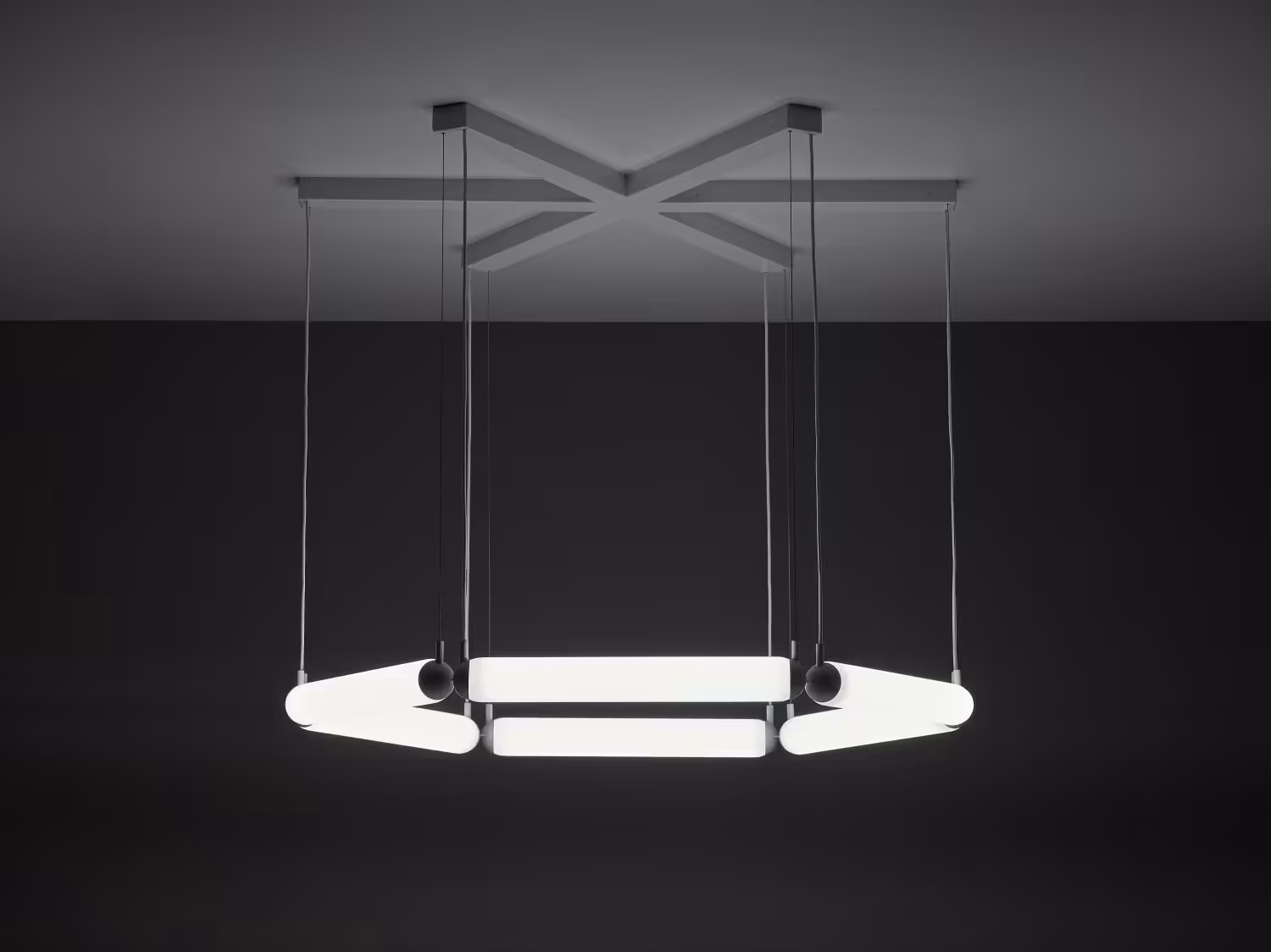 The diffused glow of the Puro Contour Hexagon 600 to elicit a dynamic ambience, while the alternating gloss and matte finishes provide a degree of provocation. Puro offers atmospheric room lighting as well as lighting for offices, hospitality interiors, boutiques, showrooms and private dining areas.