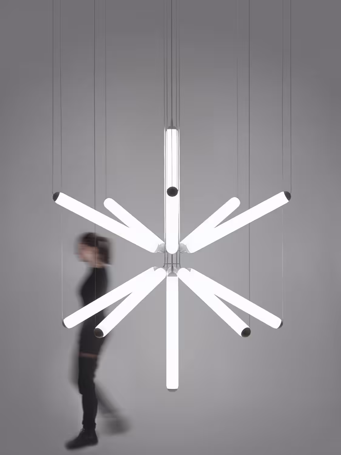 The endless variability of the Puro collection has given rise to the suspension light called Sparkle 800. This amazing lighting object shines with noble yet minimalistic geometry and constitutes the centrepiece of any space. The multiple tubes of matt opal or smoke grey glass radiate outward in diffuse light for a magical interior ambience and dynamic.