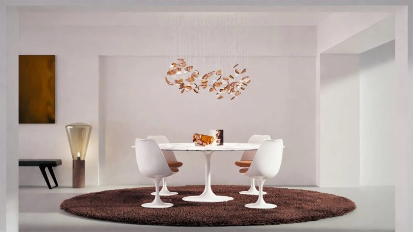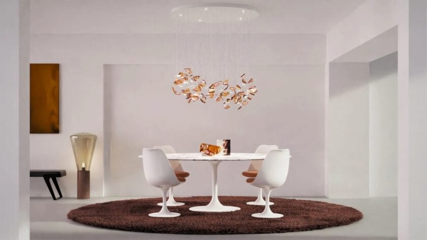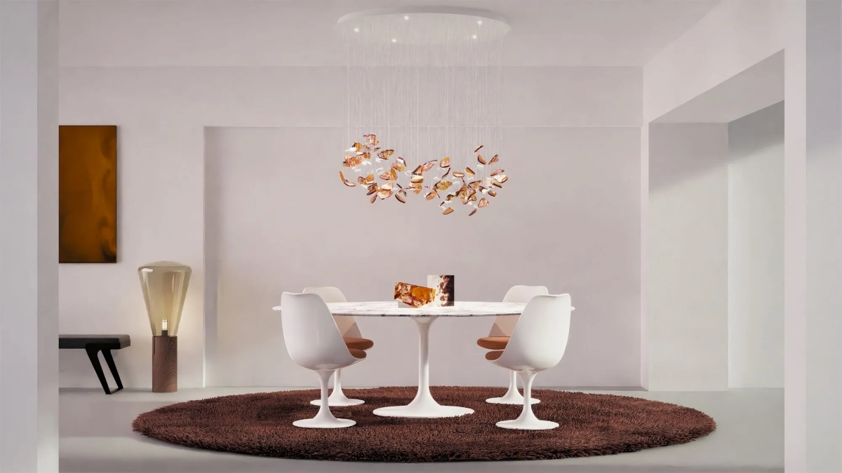 Inspired by nature’s most delicate moments, its organic shapes evoke the serene movement of autumn leaves or flower petals drifting through the air. The remarkable qualities of the material ensure that no two segments are alike, making each one a unique work of art. The diverse forms, sizes, and arrangements of the glass shard offer endless creative possibilities.
