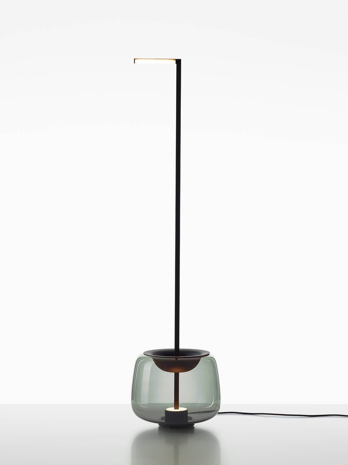 The upper metal section seeks equilibrium in the scattered light and shadows as they pass through the lower metal ring and globe, the latter crafted from multiple layers of molten glass that are carefully scrutinized by the master glassmaker prior to blowing. The luminance of the LED light source is softened by a diffusor.