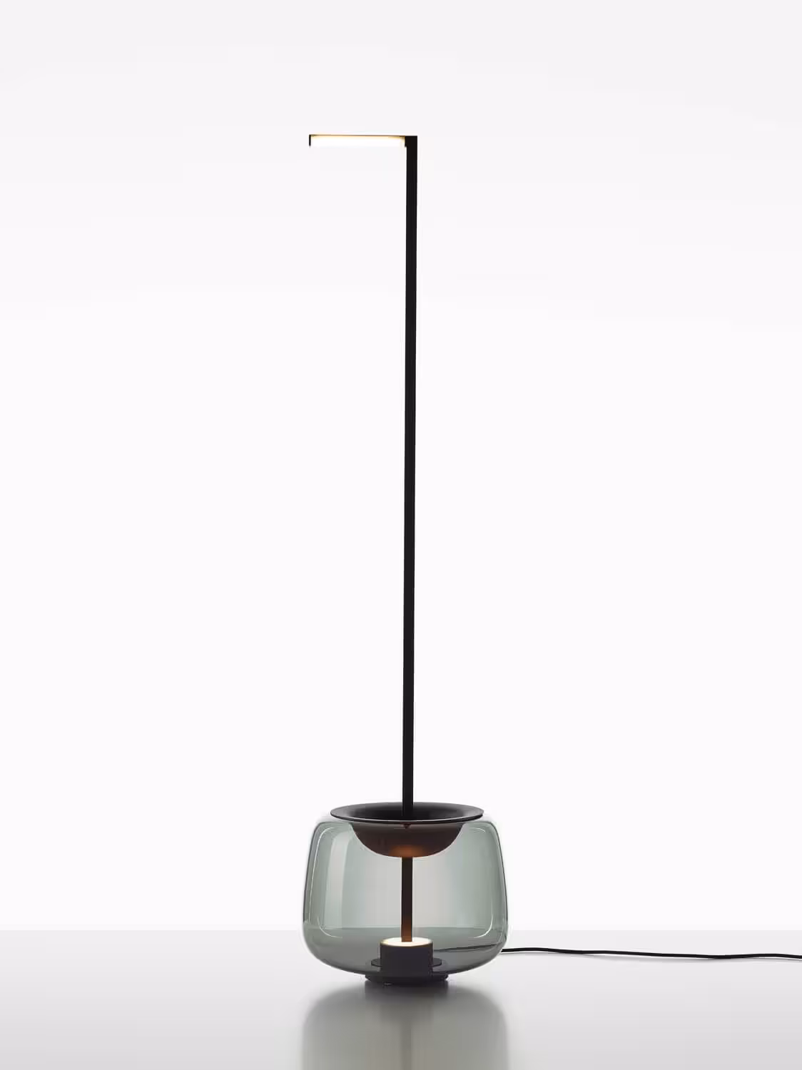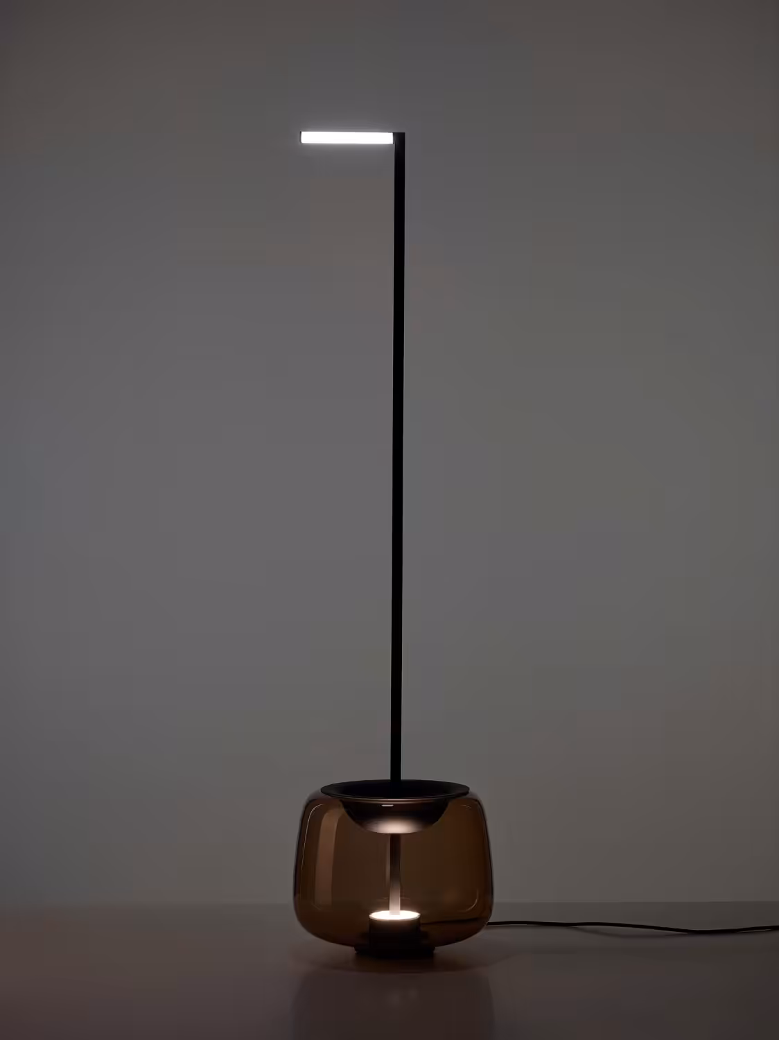 In the Double Floor, the upper metal section seeks equilibrium in the scattered light and shadows as they pass through to the metal base and globe, the latter crafted from multiple layers of molten glass that are carefully scrutinized by the master glassmaker prior to blowing. The luminance of the LED light source is softened by a diffusor.