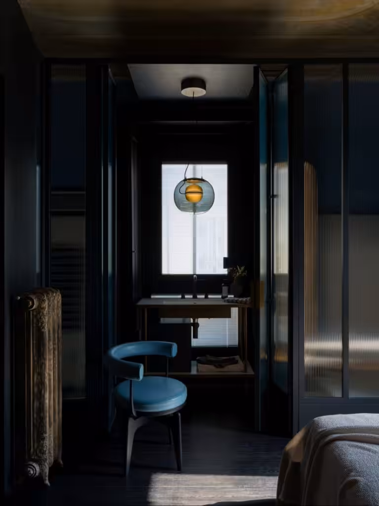 This large-format light with matte core embodies a gentle poetry, simplicity, purity, and balanced proportions. he light emitted from the smaller glass core flows freely through the atoms of air within the symbolic protective shell of the outer globe, while the sophisticated design of a bubble suspended in a large sphere evokes a sense of levitation.