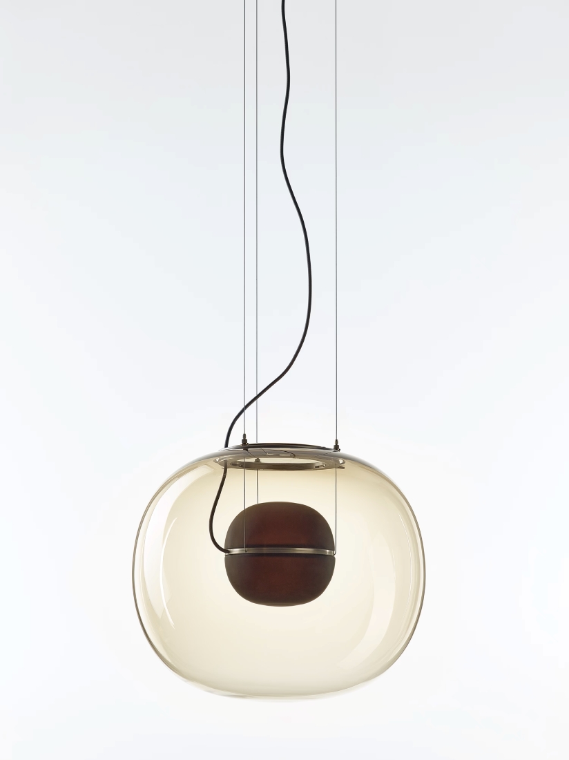 This large-format light with matte core embodies a gentle poetry, simplicity, purity, and balanced proportions. he light emitted from the smaller glass core flows freely through the atoms of air within the symbolic protective shell of the outer globe, while the sophisticated design of a bubble suspended in a large sphere evokes a sense of levitation.