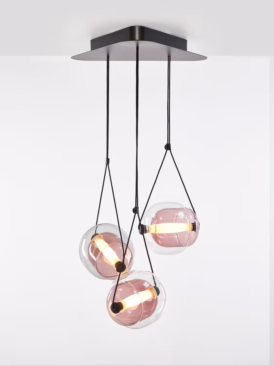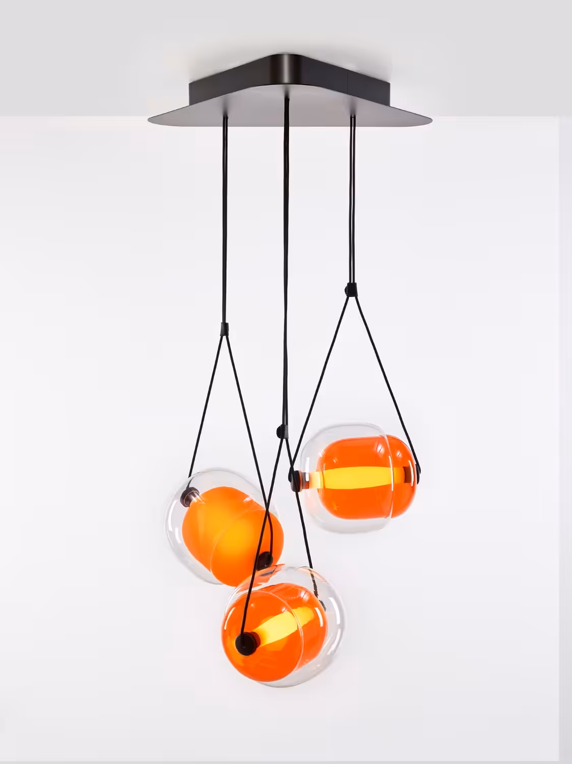 The layering and overlapping of the distinct inner and outer glass shades of the Capsula Triangle give rise to dramatic optical effects. The end caps fasten the components together and serve as anchor points for the creative dual suspension straps, which also conceal the power cable and allow for variation in the final positioning of the light.