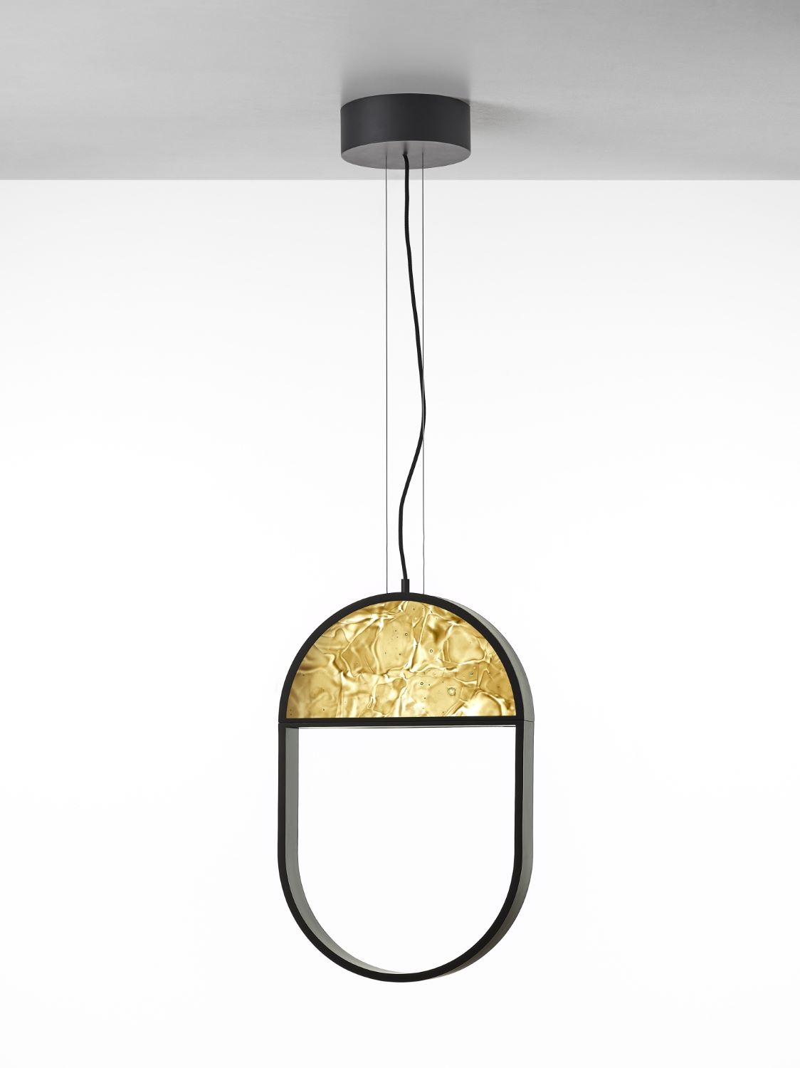 The collection is defined by basic geometric shapes that characterize the overall contours of the lights and instil them with a singular graphic element to achieve a striking contrast with the animate, almost sculptural makeup of the glass. The suspension components make up the glass geometric shapes, their edges rendered in black profiles.