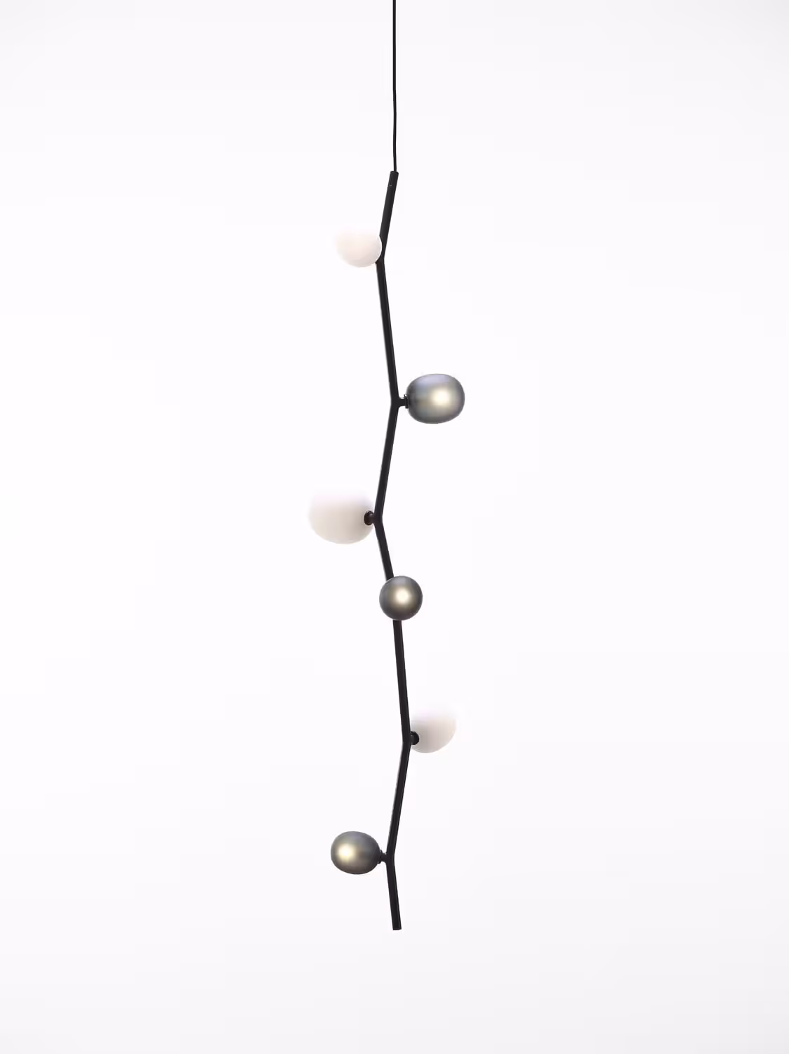Ivy is a modular system featuring glass components of three colours positioned on branches in a top-to-bottom sequence according to the design of the light. Glass colours can be combined on the light according to client’s preferences.