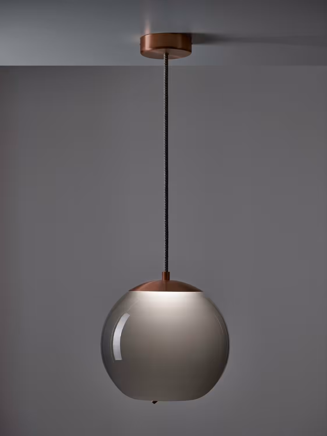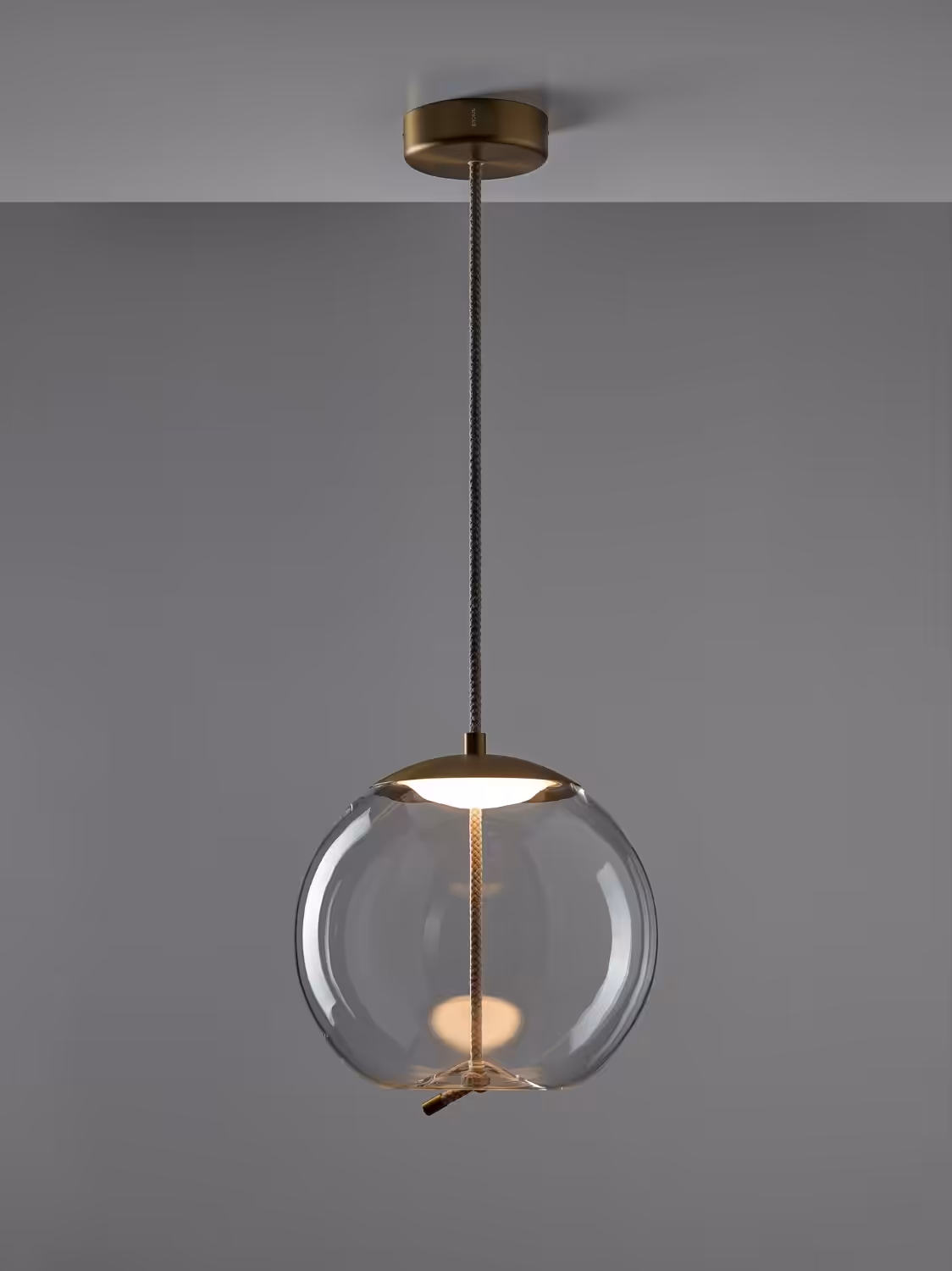 The full-bodied Sfera globe is penetrated by robust rope ending in the core design element – the knot – which seemingly pulls the bottom of the glass inward for a bemusing plastic effect. The LED light source is mounted beneath an elegant hood made of stamped metal and protected from below by a handblown opal diffusor. Another metal component serves to cap the end of the rope.