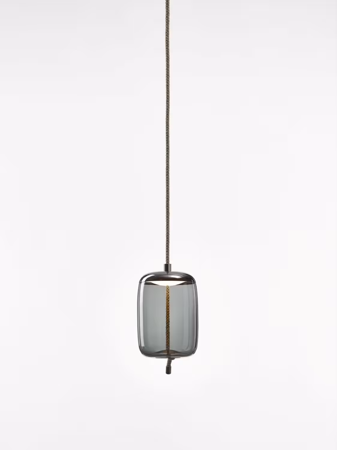 The full-bodied Small Cilindro globe is penetrated by robust rope ending in the core design element – the knot – which seemingly pulls the bottom of the glass inward for a bemusing plastic effect. The LED light source is mounted beneath an elegant hood made of stamped metal and protected from below by a handblown opal diffusor. Another metal component serves to cap the end of the rope.