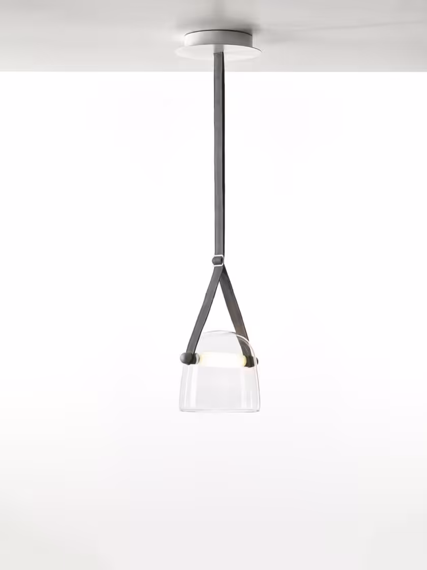 The Mona collection is based on the concept of penetrating forms. The light source boldly traverses the ample volume of smooth handblown glass to reveal the thrilling tension inherent in the design.