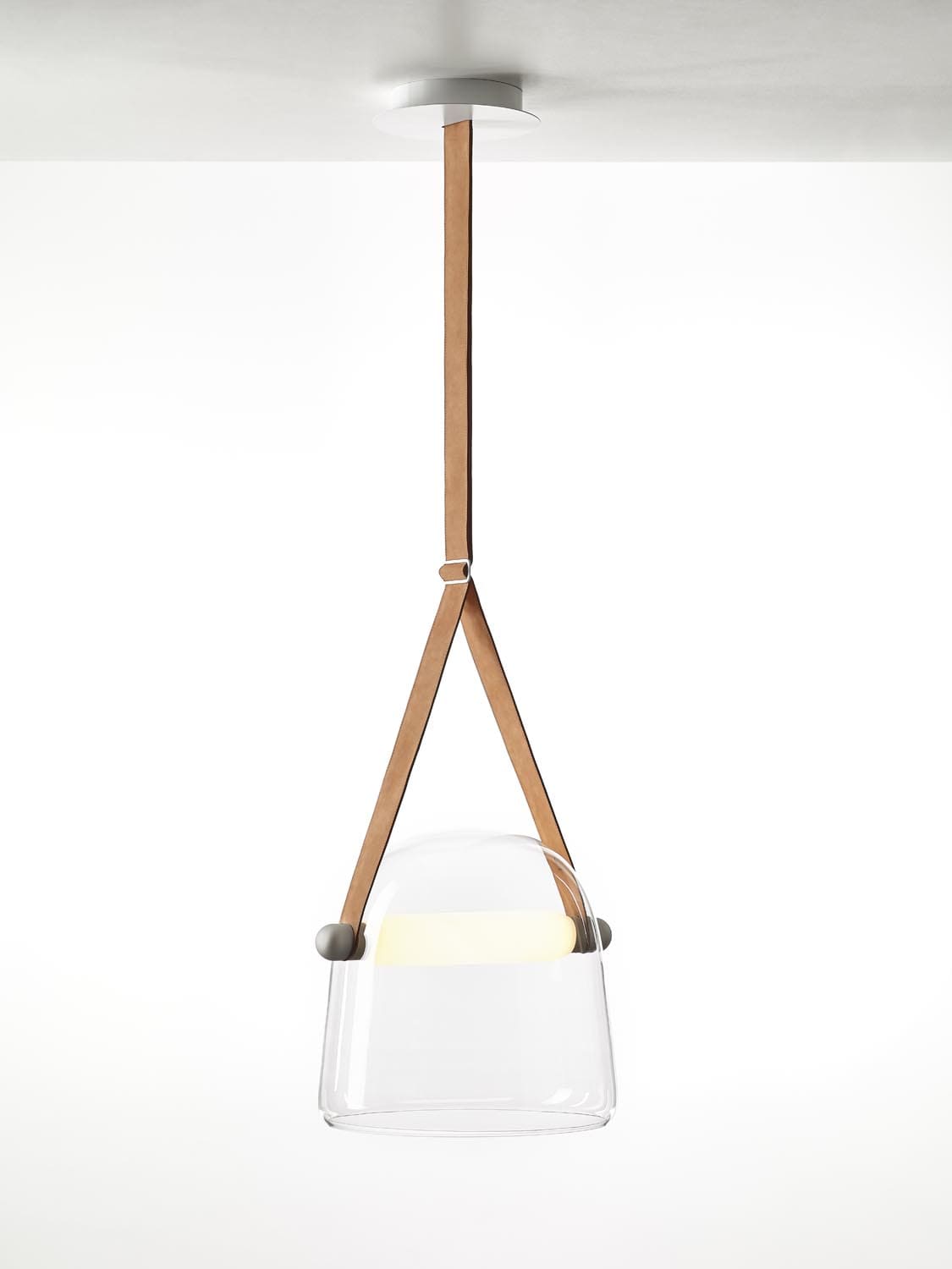 The Mona collection is based on the concept of penetrating forms. The light source boldly traverses the ample volume of smooth handblown glass to reveal the thrilling tension inherent in the design.