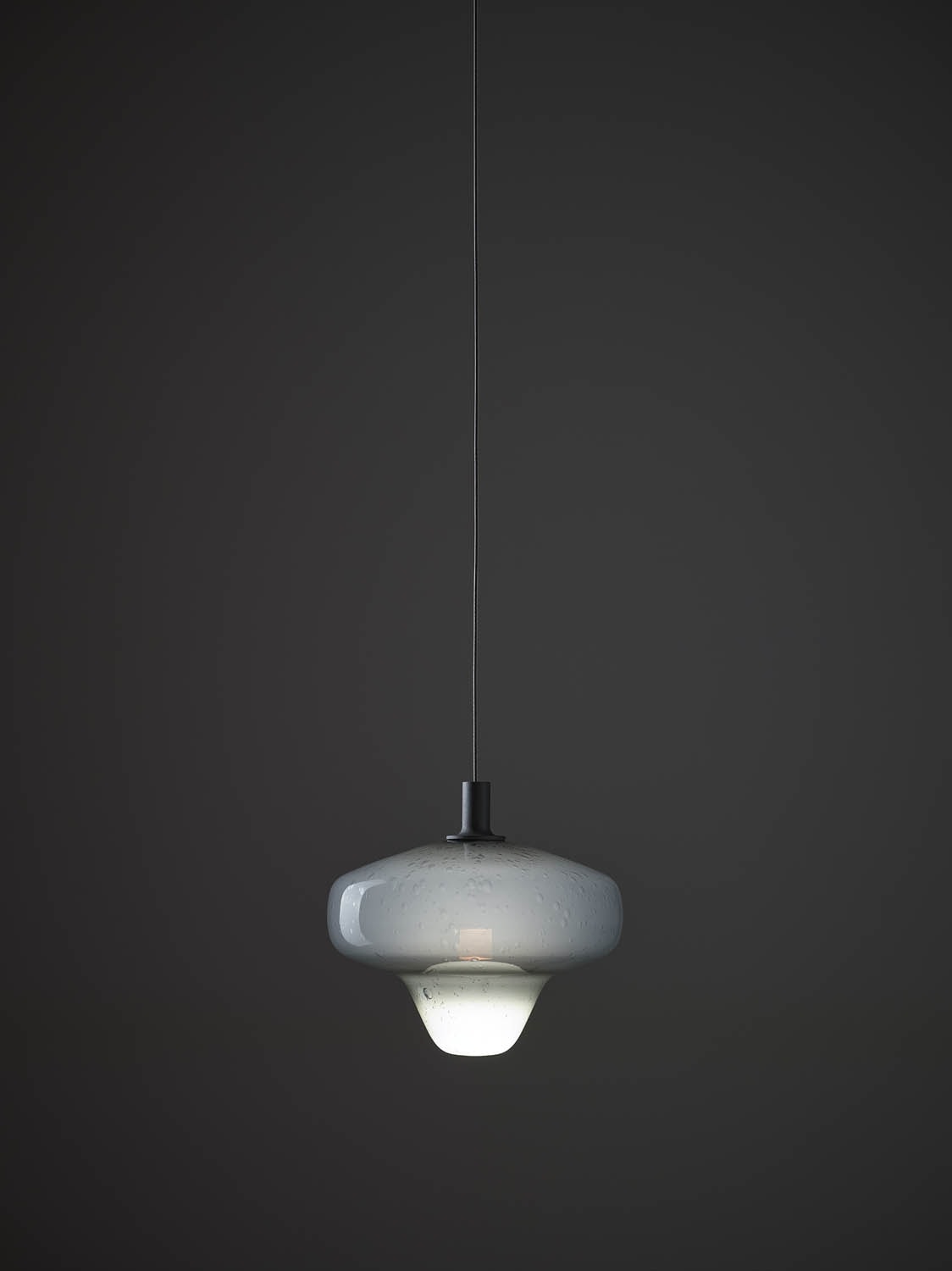Suspended on slender coaxial cables of varying lengths, the delicate handlbown glass shades are available in four variants: opaque opaline, pearl pink opaline, pearl grey opaline, and olive opaline. Each with its own custom ceiling canopy. Starcloud thus provides a remarkable degree of variability, inviting users to create their own holly unique interior starscapes.