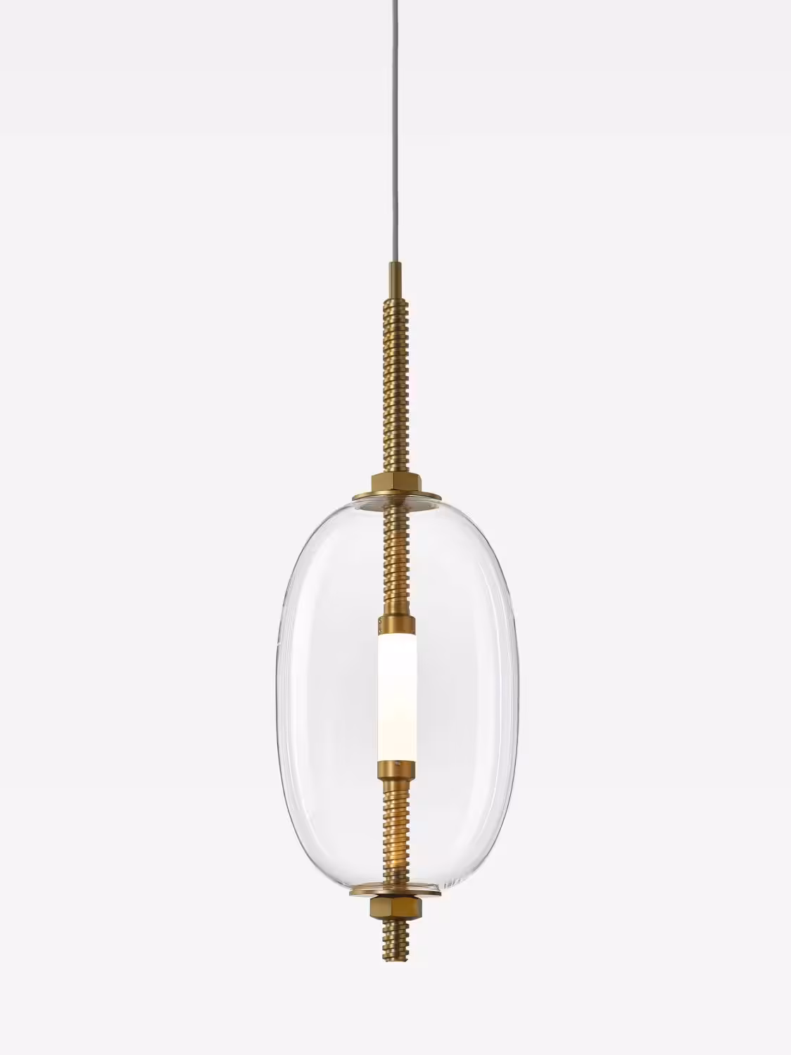 This striking visual effect is further accentuated with technical elements, such as a centre-line threaded rod that penetrates the delicate glass globe and brings a touch of geometric regularity and industrial elegance. Under Pressure Vertical Little delivers an impressive contrast, an alluring juxtaposition of the organic malleability of glass and uncompromising precision of metal.