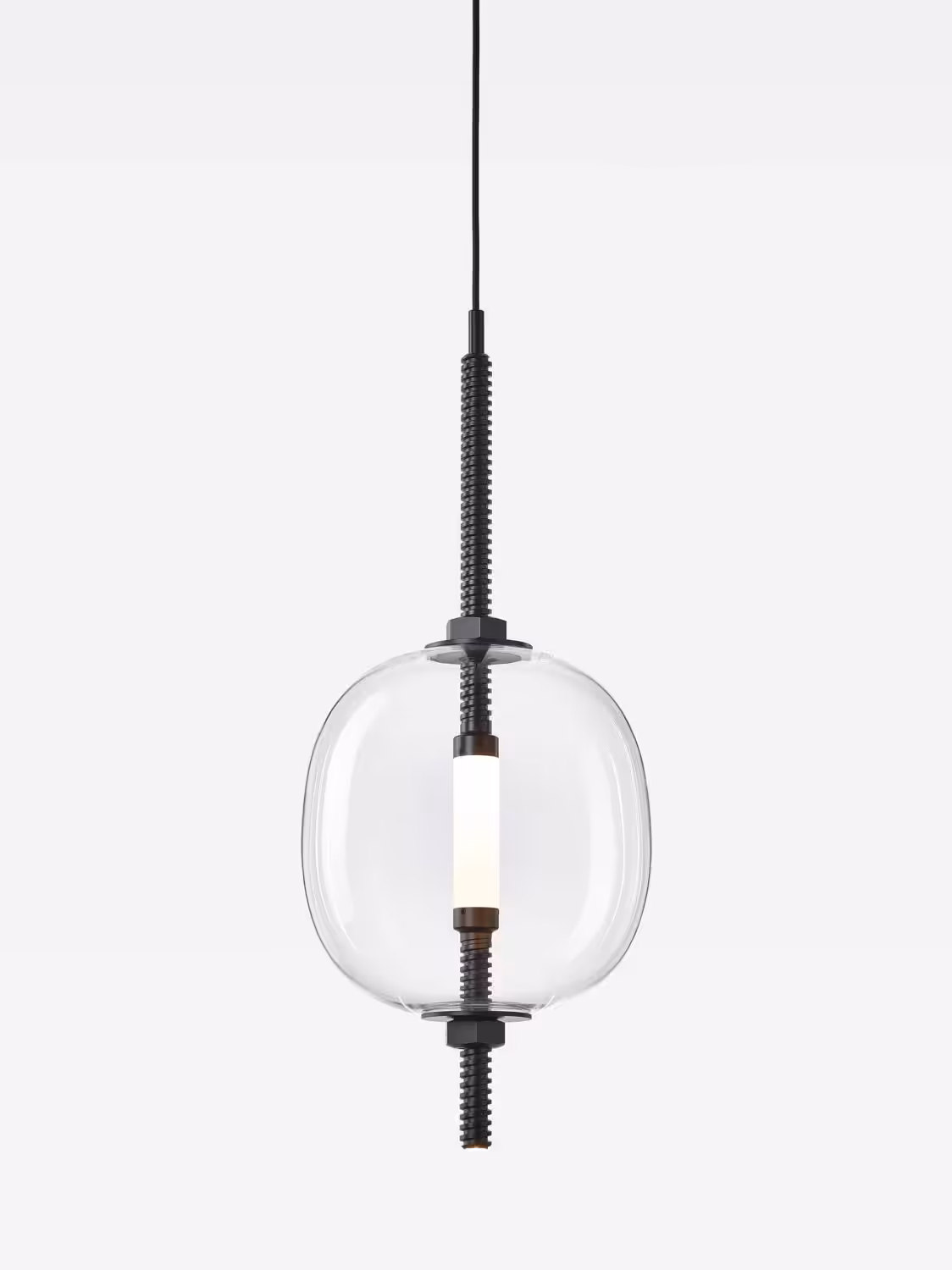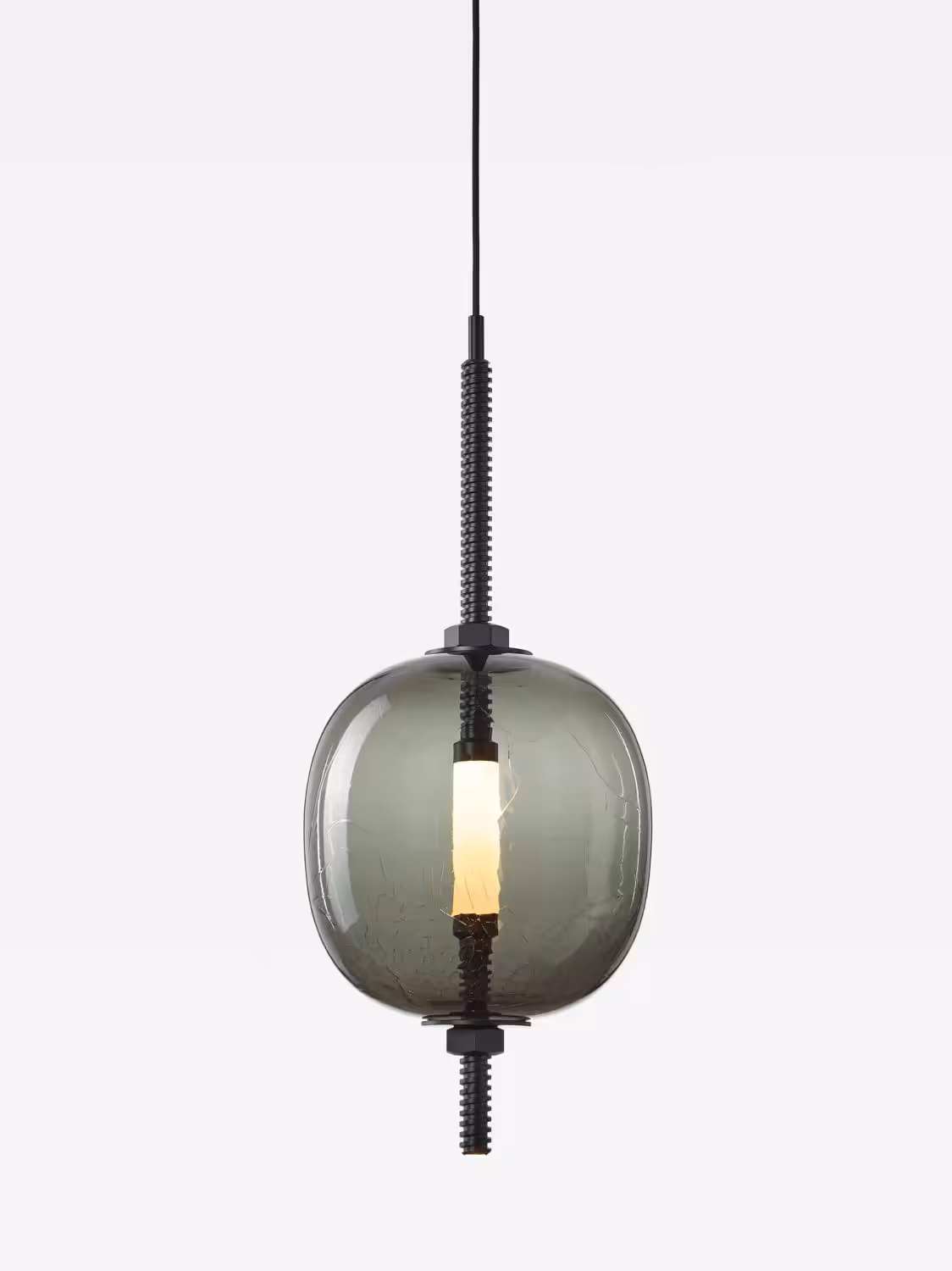 This striking visual effect is further accentuated with technical elements, such as a centre-line threaded rod that penetrates the delicate glass globe and brings a touch of geometric regularity and industrial elegance. Under Pressure Vertical More delivers an impressive contrast, an alluring juxtaposition of the organic malleability of glass and uncompromising precision of metal.