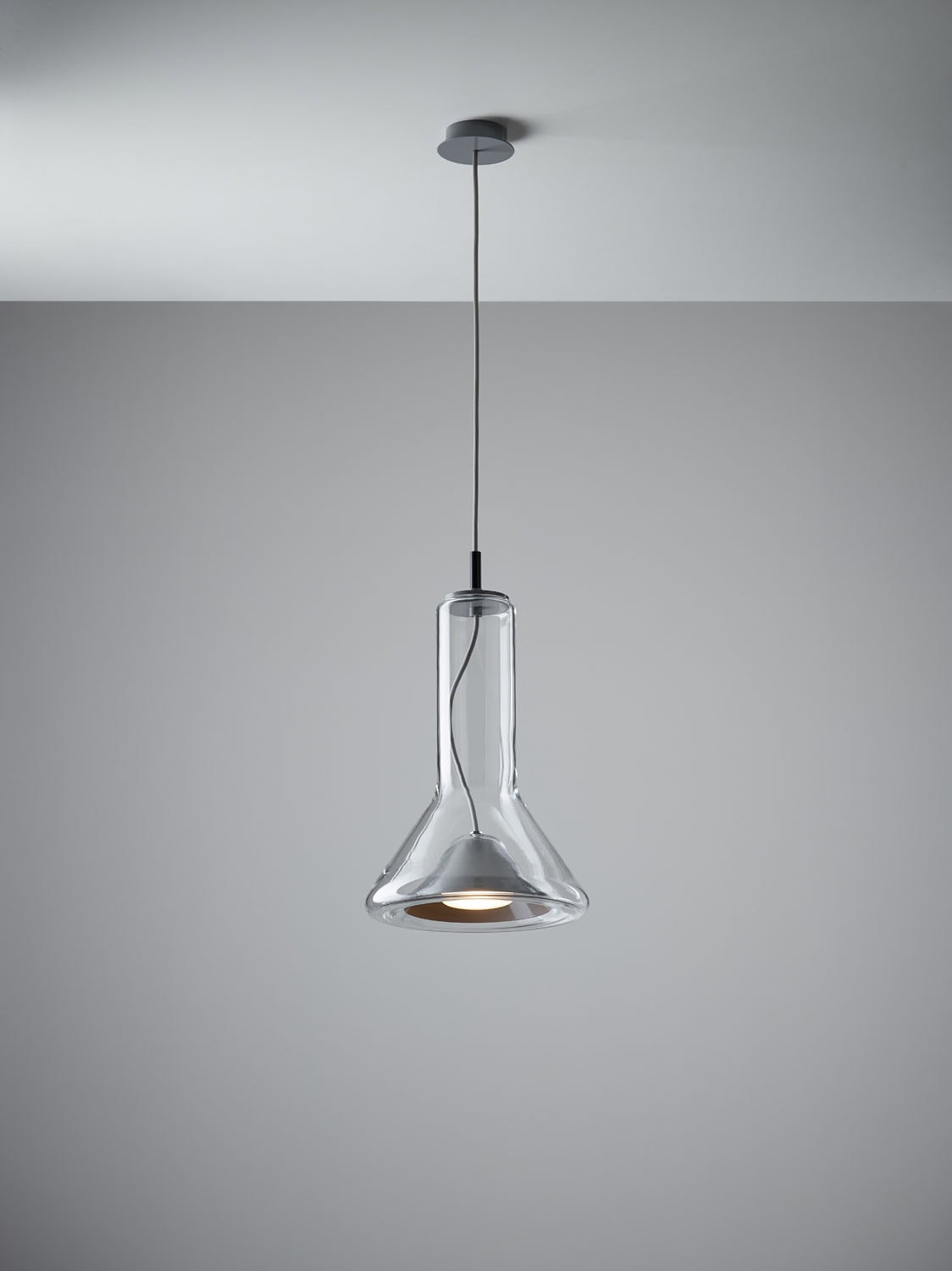The lucid body of the Whistle Small traces the silhouette of a cone of light. A distinct spotlight with hand-pressed metal shield and a naked cable winding its way up through the body of the light define the character of its simplistic technical form.