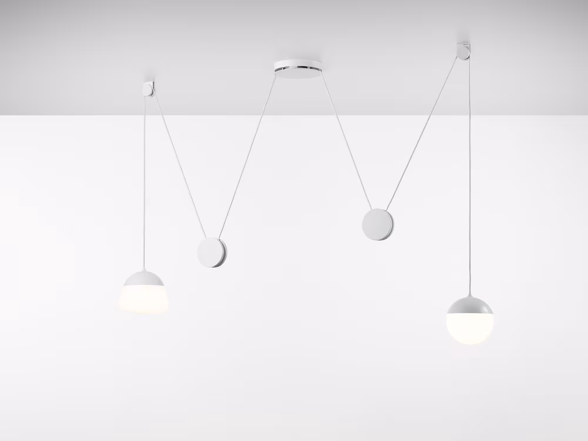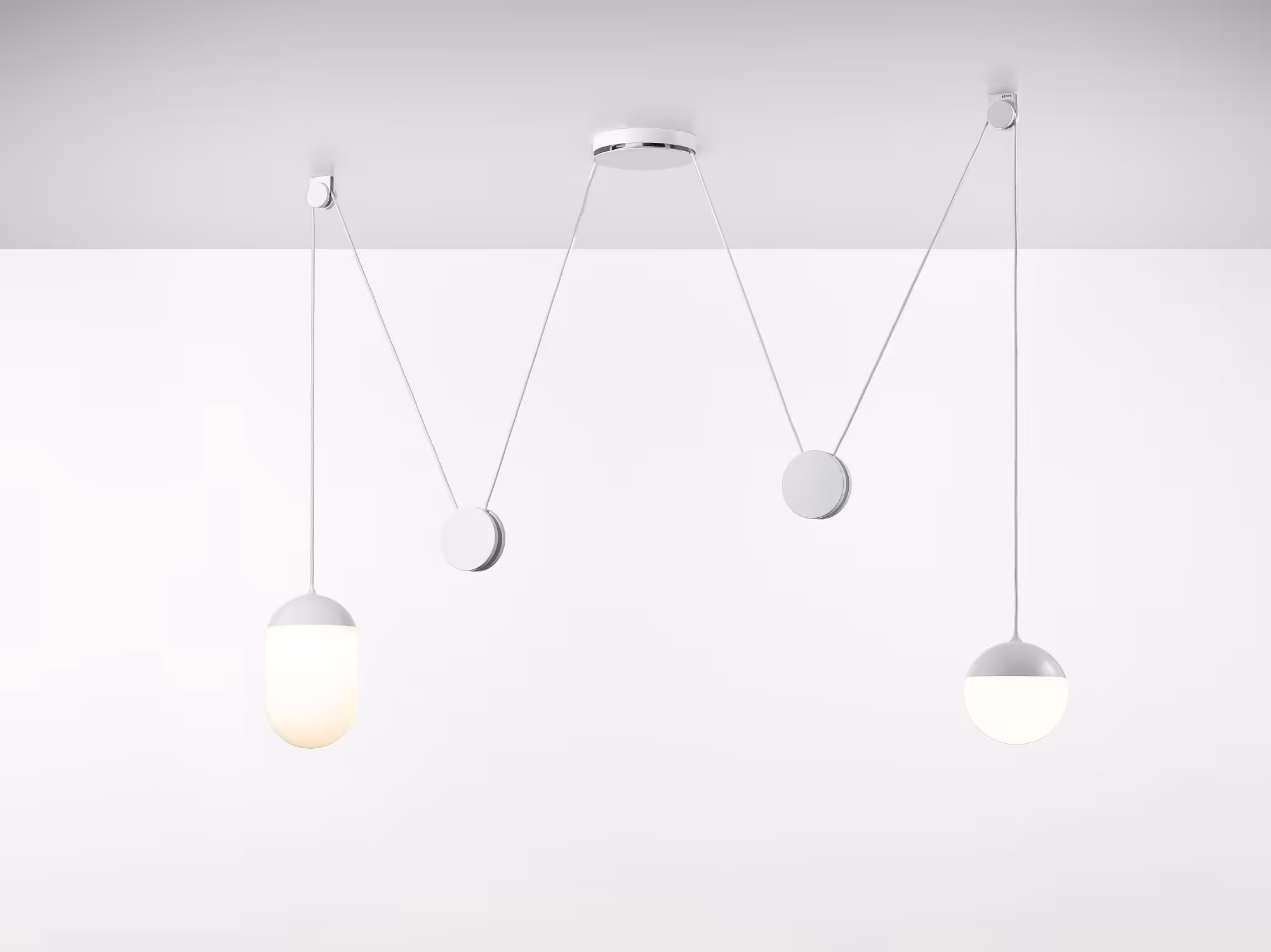 The use of weights and pulleys makes it possible to quickly adjust the height of Planets 2, a unique system that allows for several groupings to serve as individual sources of light in an interior, or as multiples of three different shapes to illuminate larger spaces.