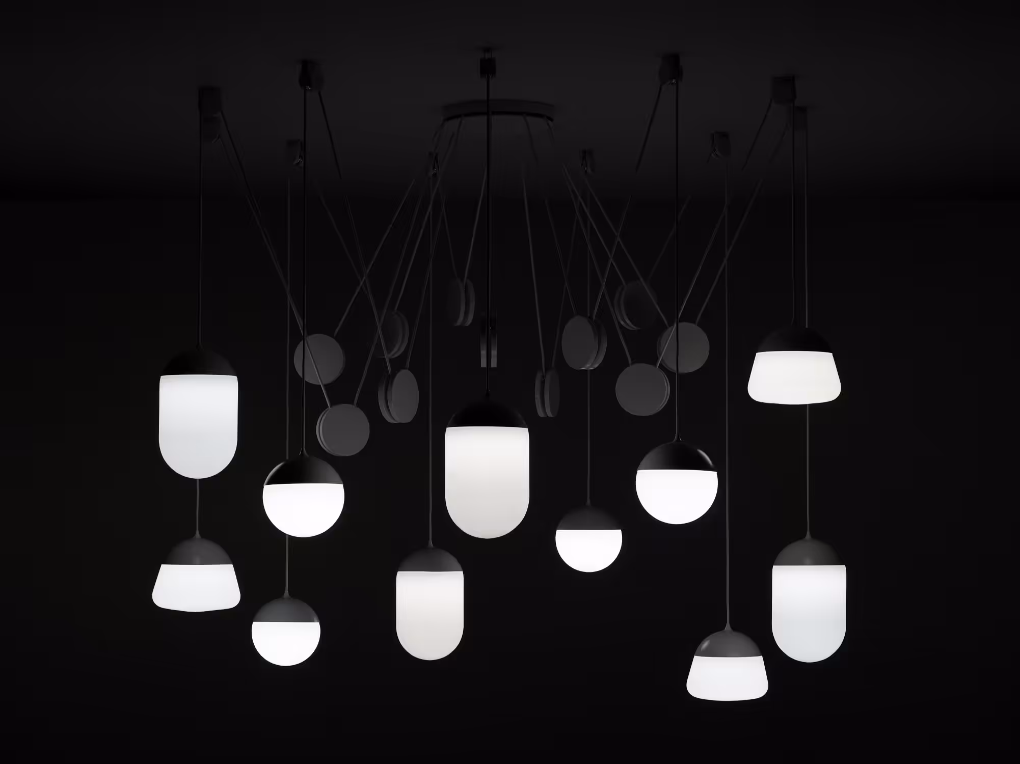 The use of weights and pulleys makes it possible to quickly adjust the height of Planets MINI 11, a unique system that allows for several groupings to serve as individual sources of light in an interior, or as multiples of three different shapes to illuminate larger spaces. The counterweight is precisely calibrated to the specific weight of the light, so adjusting it is safe and easy.