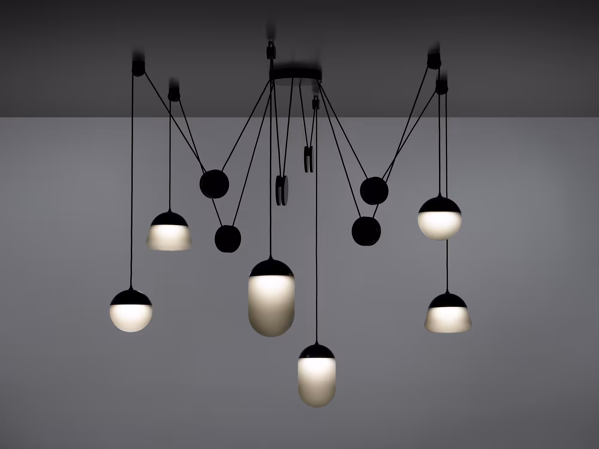 The use of weights and pulleys makes it possible to quickly adjust the height of Planets MINI 6, a unique system that allows for several groupings to serve as individual sources of light in an interior, or as multiples of three different shapes to illuminate larger spaces. The counterweight is precisely calibrated to the specific weight of the light, so adjusting it is safe and easy.