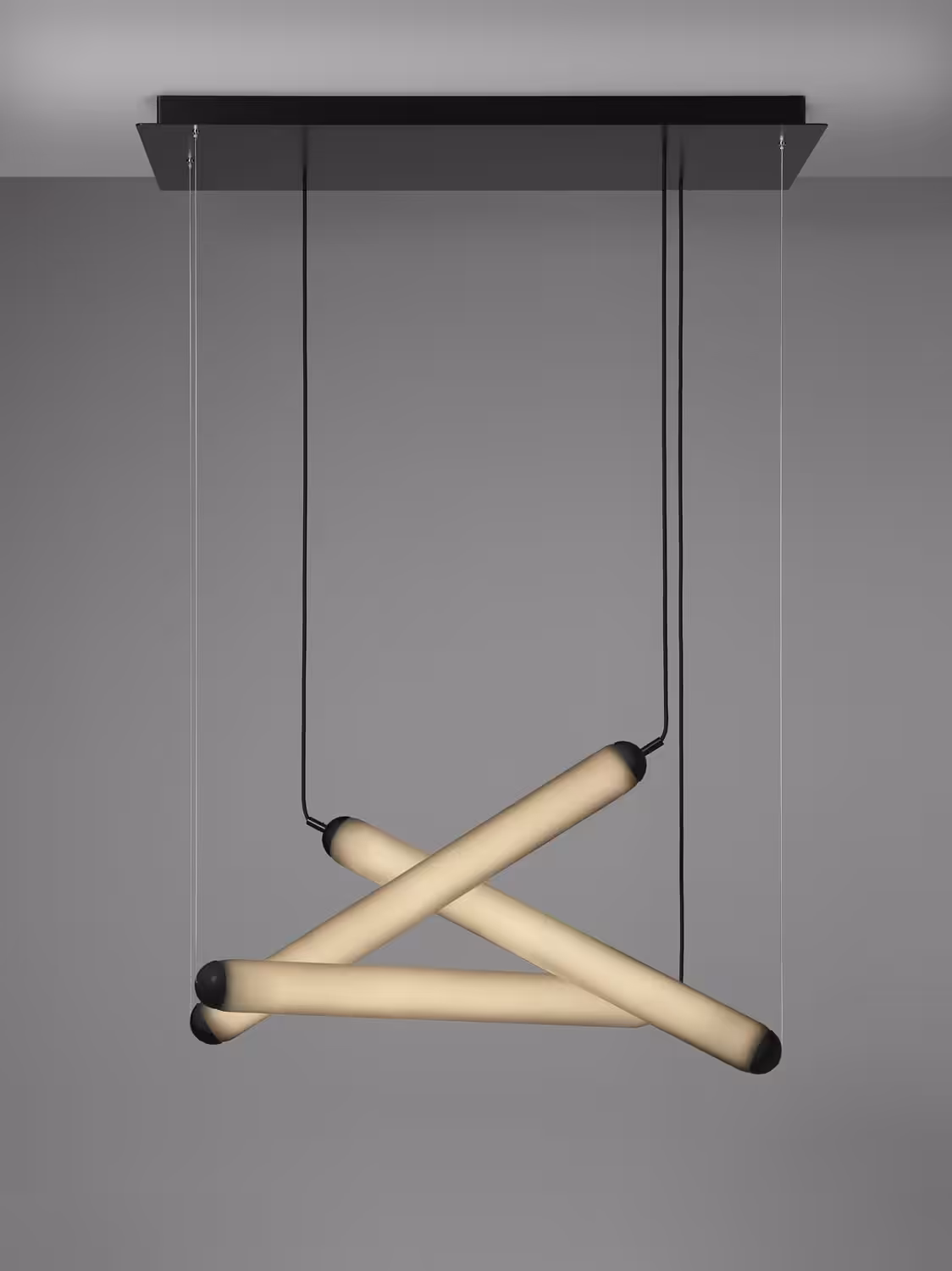 Puro Eclectric Rectangular Set 800 is a suspension light composition comprising handblown Puro tubes. The diffused glow of the tubes to elicit a dynamic ambience, while the alternating gloss and matte finishes provide a degree of provocation.