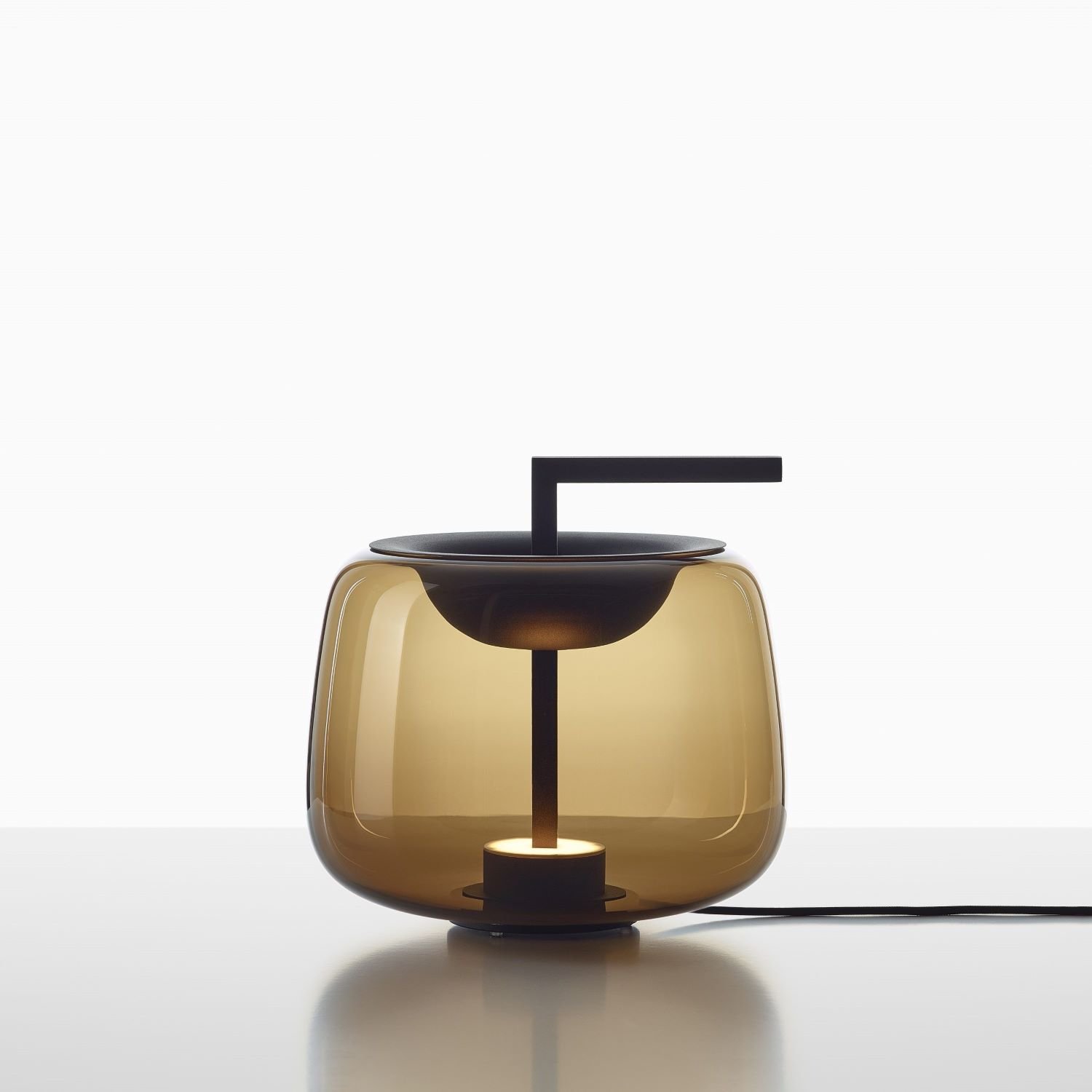 In the Double Table, the upper metal section seeks equilibrium in the scattered light and shadows as they pass through to the metal base and globe, the latter crafted from multiple layers of molten glass that are carefully scrutinized by the master glassmaker prior to blowing. The luminance of the LED light source is softened by a diffusor.