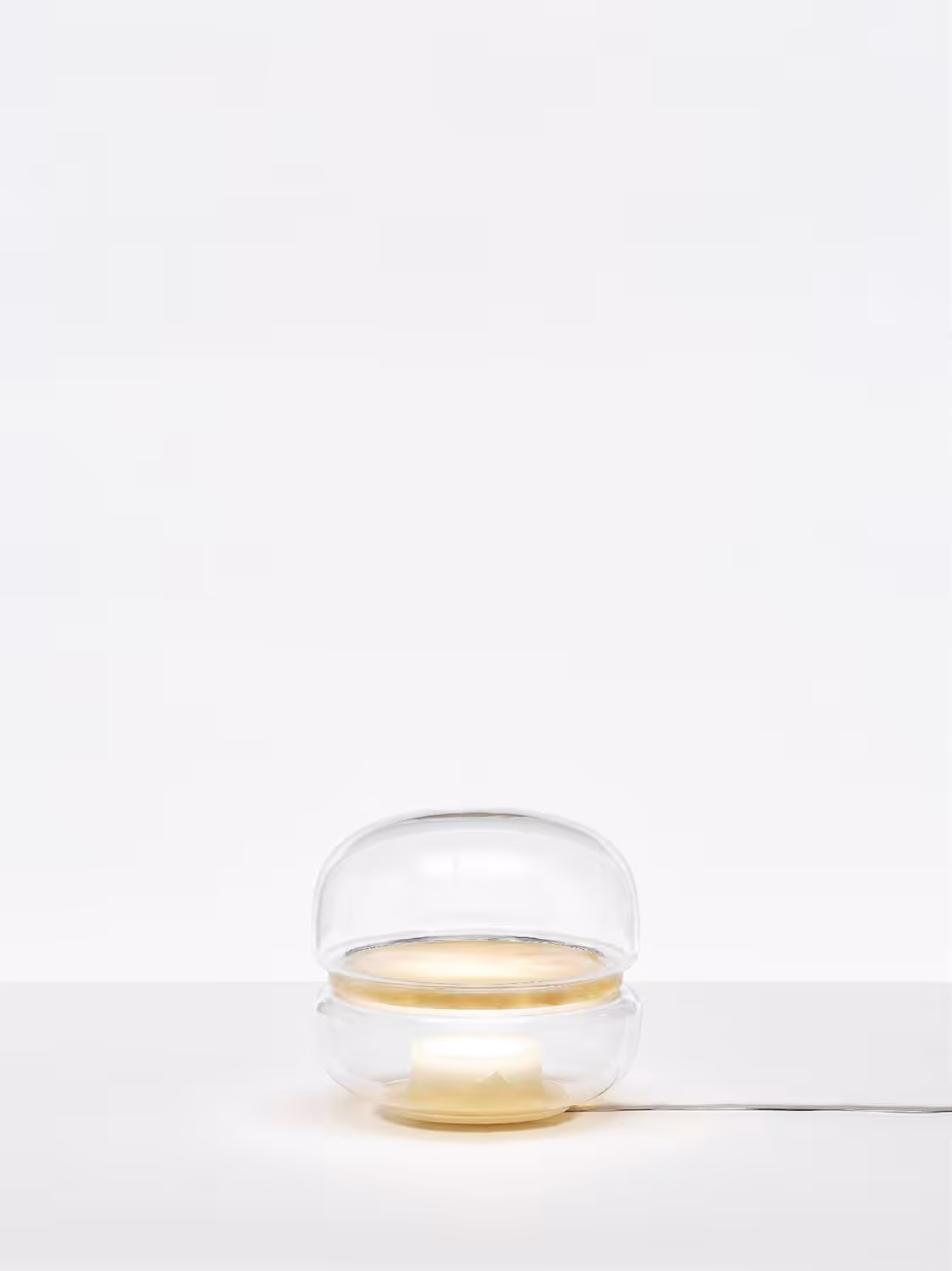 The Macaron table light pays homage to the beauty and complex structures of crystalline stone. Enclosed in opposing domes of delicate handblown glass, the stone becomes a moonscape afloat in its own cosmos.