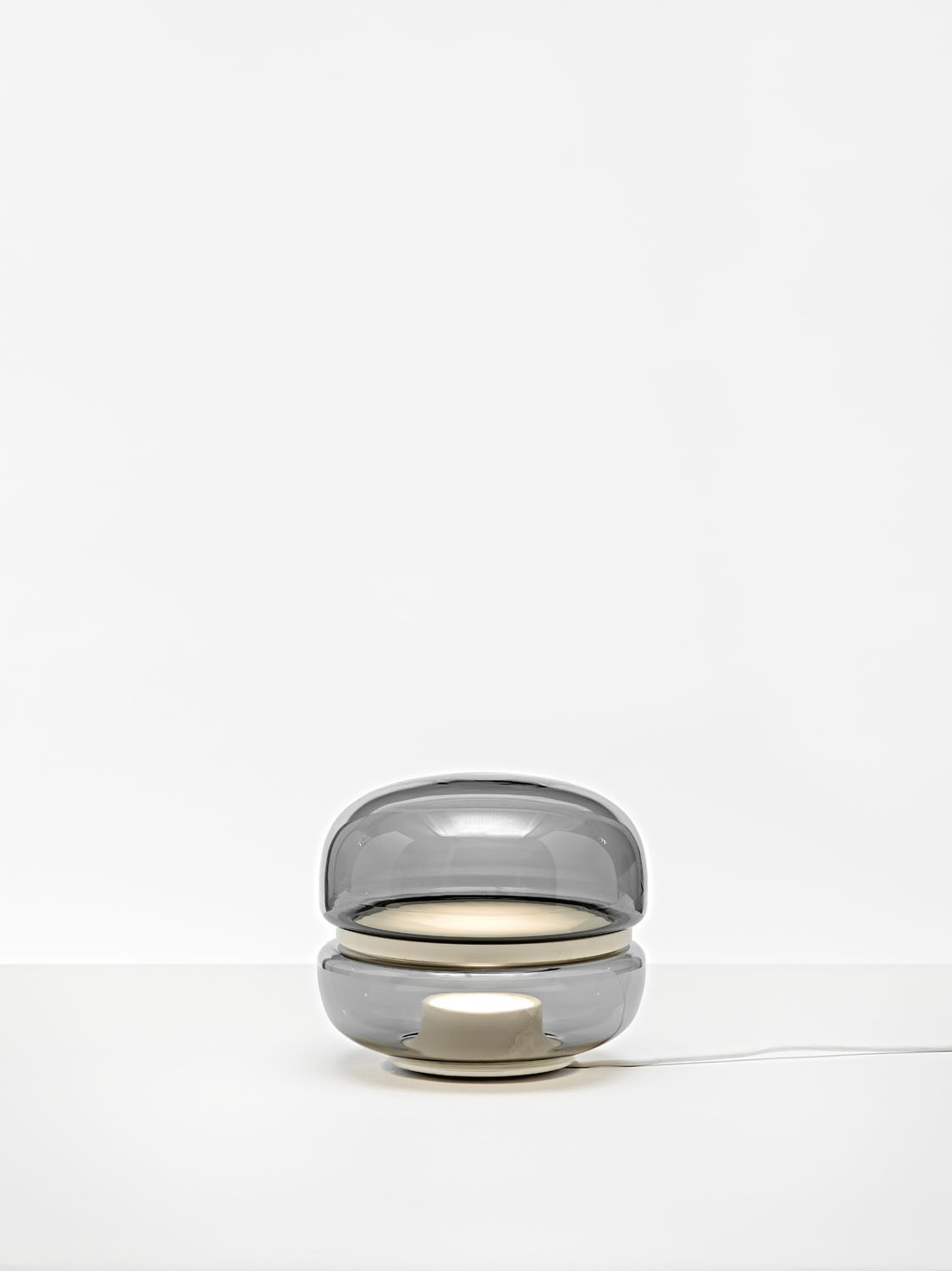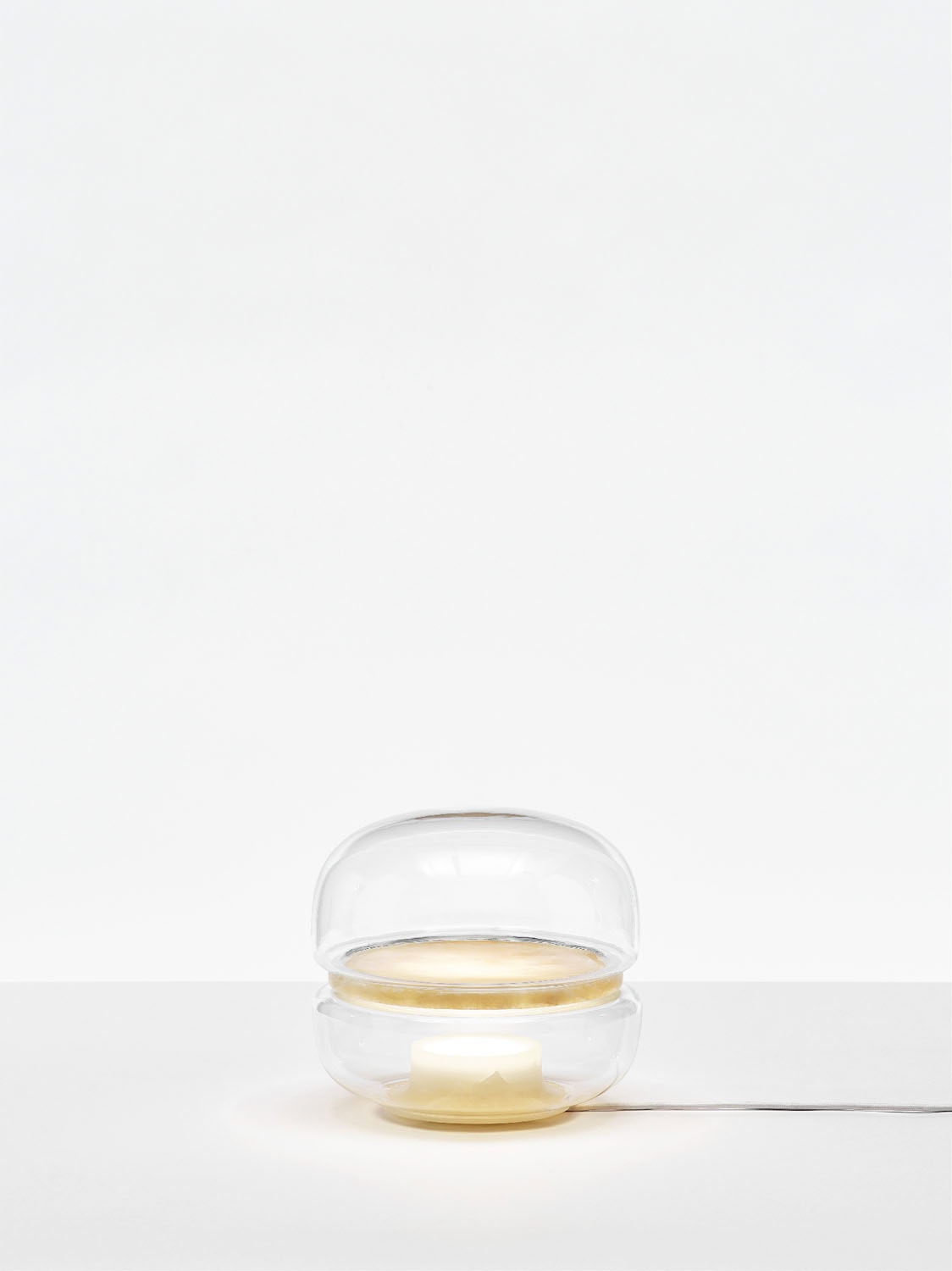 The Macaron table light pays homage to the beauty and complex structures of crystalline stone. Enclosed in opposing domes of delicate handblown glass, the stone becomes a moonscape afloat in its own cosmos.