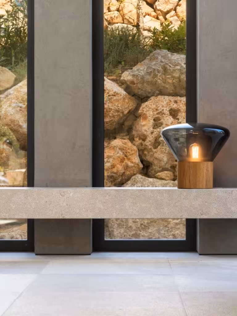 Used in architecture from ancient Roman amphitheatres to modern landmarks, this rare stone enriches Muffins with its unmistakable structure of subtle pores and strata and with warm, earthy tones. It forms a refined yet natural counterpart to the delicate contours of handblown glass and lends the collection a new aesthetic dimension.