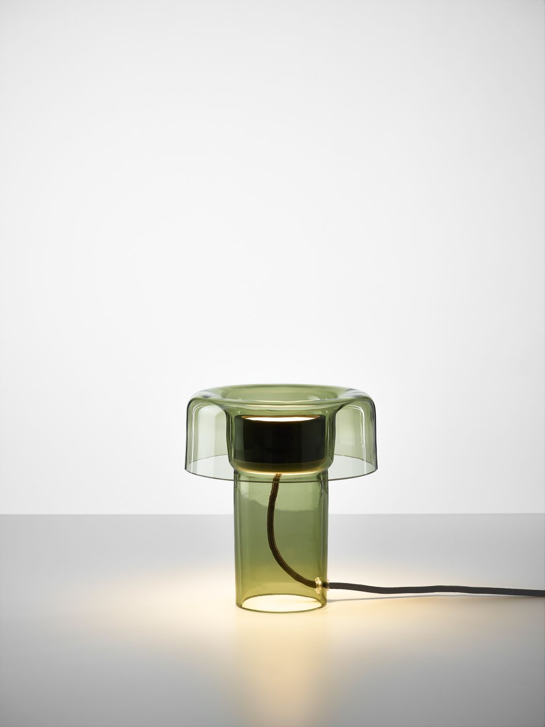 The archetypal silhouette in a purity-of-form concept has an opening with a double-sided light source in an aluminium fixture. The flat source casts its light gently in two directions, upwards and downwards into the glass base, creating intimate atmospheric effects. A specialized method of glassblowing is needed to create the mantle as a single piece. The overall appearance of the light emphasizes the idea that beauty lies in simplicity.